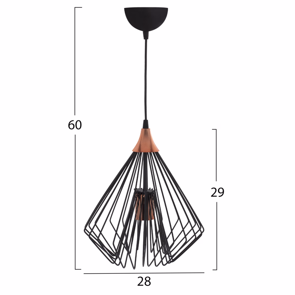 Φωτιστικό οροφής, σε μαύρη απόχρωση με χάλκινη λεπτομέρεια. Ένα φωτιστικό εξαιρετικής ποιότητας, με ξεχωριστό design,πρωτότυπο και κομψό στιλ, για την ανανέωση της διακόσμησης του προσωπικού σας χώρου. Κατασκευασμένο από μεταλλικό σκελετό, εξαιρετικής αντοχής. Διαθέτει πιστοποίηση CE Διαστάσεις: 30×60 εκ. Διαστάσεις καπέλου: 30×30 εκ. Ευρωπαϊκής κατασκευής και προέλευσης. Το προϊόν διατίθεται σε εργοστασιακή συσκευασία.