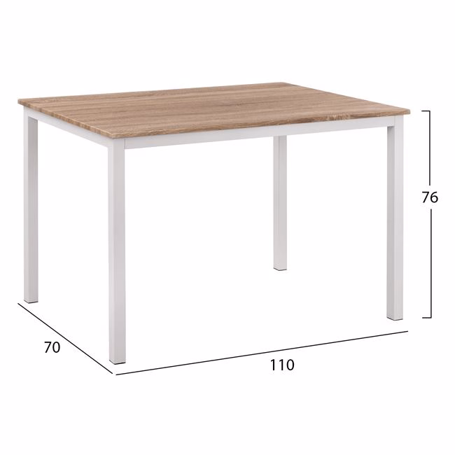 ΤΟ ΣΕΤ ΠΕΡΙΛΑΜΒΑΝΕΙ Ένα ελκυστικό μοντέρνο τραπέζι με μεταλλική βάση λευκής απόχρωσης και sonama επιφάνεια από mdf. Διαστάσεις: 110x70x76Υ εκ. Πάχος επιφάνειας: 1,5 εκ. Τέσσερις καρέκλες με κάθισμα από πολυπροπυλένιο σε λευκή απόχρωση και μεταλλικά πόδια με απόδοση στο φυσικό χρώμα του ξύλου. Διαστάσεις: 43×46,5×82 εκ. Ύψος καθίσματος: 48 εκ. Διαστάσεις καθίσματος: 38×37 εκ.