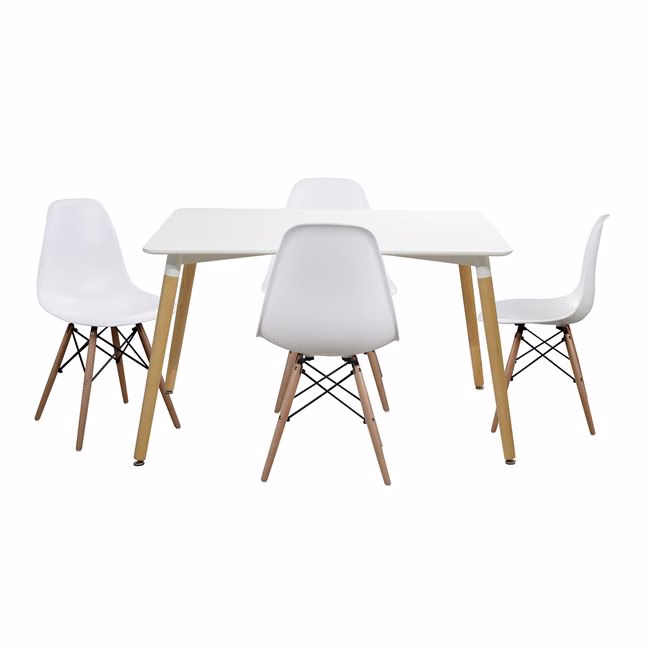 ΤΟ ΣΕΤ ΠΕΡΙΛΑΜΒΑΝΕΙ Ένα ελκυστικό μοντέρνο τραπέζι με μεταλλική βάση λευκής απόχρωσης και sonama επιφάνεια από mdf. Διαστάσεις: 110x70x76Υ εκ. Πάχος επιφάνειας: 1,5 εκ. Και 4 καρέκλες Twist από πολυπροπυλένιο σε mat υφή και λευκό χρώμα. Τα πόδια της καρέκλας είναι από μασίφ ξύλο. Διαστάσεις: 46x50x82 εκ. Ύψος καθίσματος: 44 εκ. Διαστάσεις καθίσματος: 46×40 εκ.