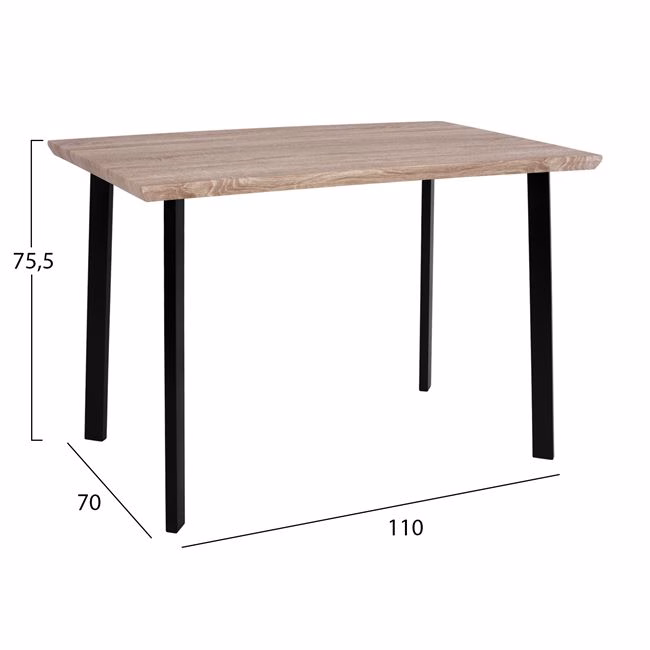 ΤΟ ΣΕΤ ΠΕΡΙΛΑΜΒΑΝΕΙ Ένα ελκυστικό μοντέρνο τραπέζι με μεταλλική βάση μαύρης απόχρωσης και sonama επιφάνεια από mdf. Διαστάσεις: 110x70x75,5 εκ. Κατέβασμα επιφάνειας: 3,5 εκ. Τέσσερις καρέκλες με κάθισμα από πολυπροπυλένιο και μεταλλικά πόδια με απόδοση στο φυσικό χρώμα του ξύλου.. Διαστάσεις: 43×46,5×82 εκ. Ύψος καθίσματος: 48 εκ. Διαστάσεις καθίσματος: 38×37 εκ.