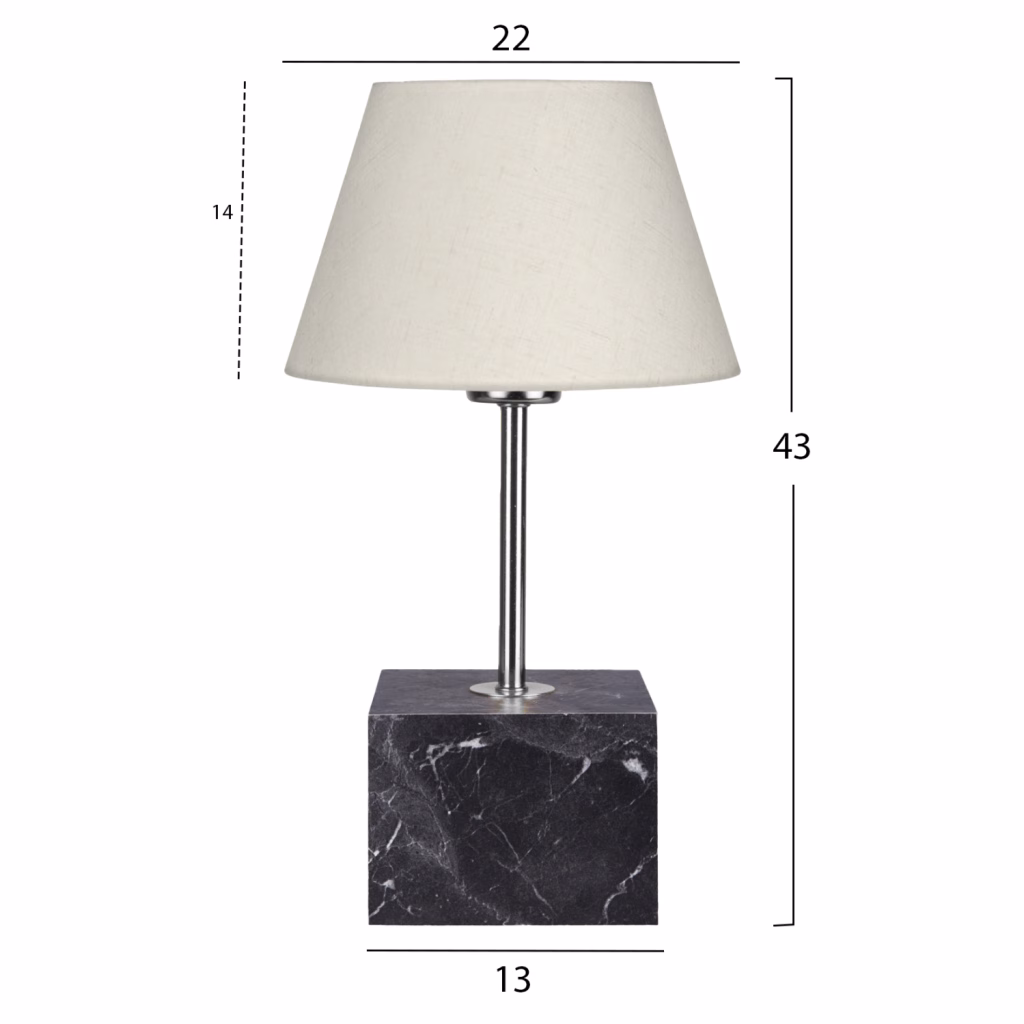 Επιτραπέζιο διακοσμητικό φωτιστικό με μονή κολώνα. Η βάση του φωτιστικού έχει το σχήμα κύβου με όψη ανθρακί μαρμάρου ενώ η κολώνα είναι σε ασημί χρώμα. Το «καπέλο» έχει τραπεζοειδές κυκλικό σχήμα σε χρώμα εκρού. Το φως διαχέεται στον χώρο ευχάριστα και η αντανάκλασή του πάνω στην χρυσή κολωνίτσα του φωτιστικού αλλά και στην κυβική βάση, […]