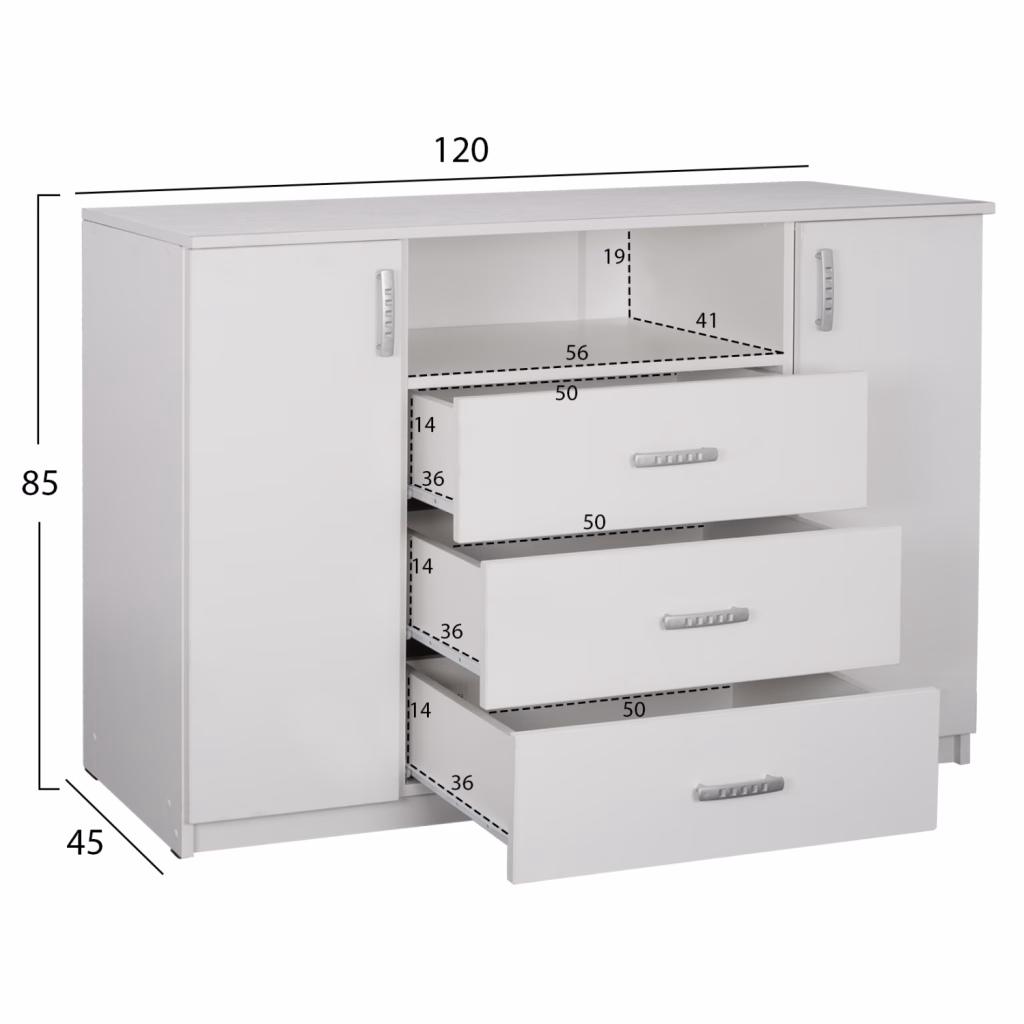 Μπουφές σε λευκή απόχρωση που θα ολοκληρώσει την αισθητική του χώρου σου, προσφέροντας σου παράλληλα έξτρα χώρους προβολής και αποθήκευσης αντικειμένων. Μία λειτουργική πρόταση διακόσμησης για το καθιστικό ή το σαλόνι σου. Διαθέτει τρία συρτάρια, δύο ντουλάπια και μία ανοικτή επιφάνεια, για να αποθηκεύετε μικρά αντικείμενα. Κατασκευασμένος από μελαμίνη εξαιρετικής ποιότητας, πάχους 16mm, με αντοχή […]