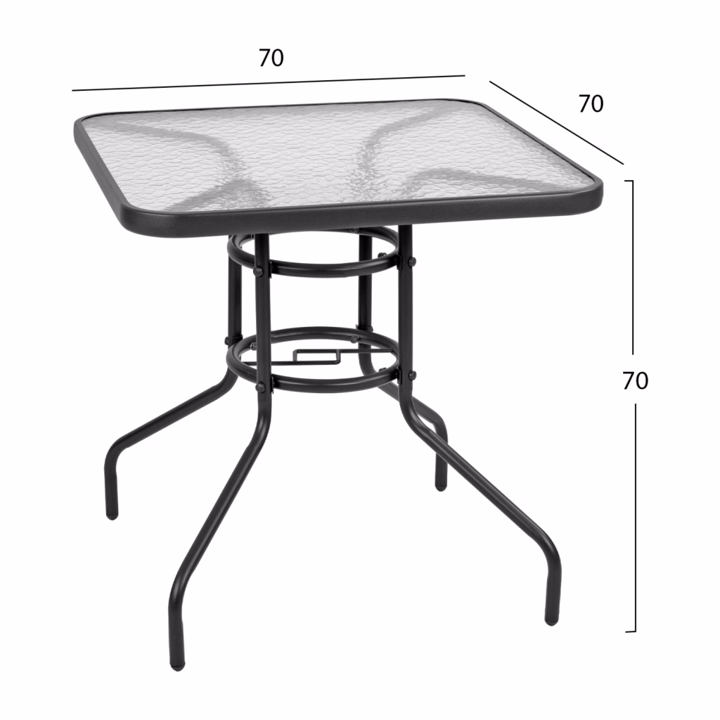ΤΟ ΣΕΤ ΠΕΡΙΛΑΜΒΑΝΕΙ Ένα τραπέζι μεταλλικό εξωτερικού χώρου σε χρώμα γκρι-ανθρακί, με ενσωματωμένο τζαμί ασφάλειας (secure). Διαστ. Τραπεζιού: 70x70x70 εκ. Δύο πολυθρόνες εξωτερικού χώρου από μεταλλικό σκελετό σε γκρι χρώμα με textilene 2×1 μεγάλης αντοχής σε ήλιο και βροχή. Διαστ. Καρέκλας: 54x70x93 εκ. Ύψος καθίσματος: 43 εκ. Ύψος μπράτσων: 59 εκ.
