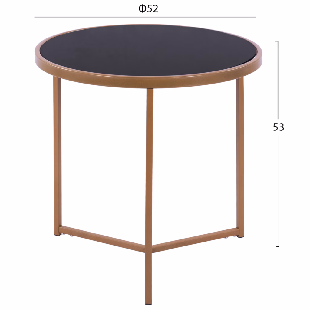 Βοηθητικό τραπεζάκι σαλονιού FRANCESCO, κατασκευασμένο από μεταλλικό χρυσό ματ σκελετό και γυάλινη μαύρη επιφάνεια. Διαστάσεις: Φ52×53Υ εκ.