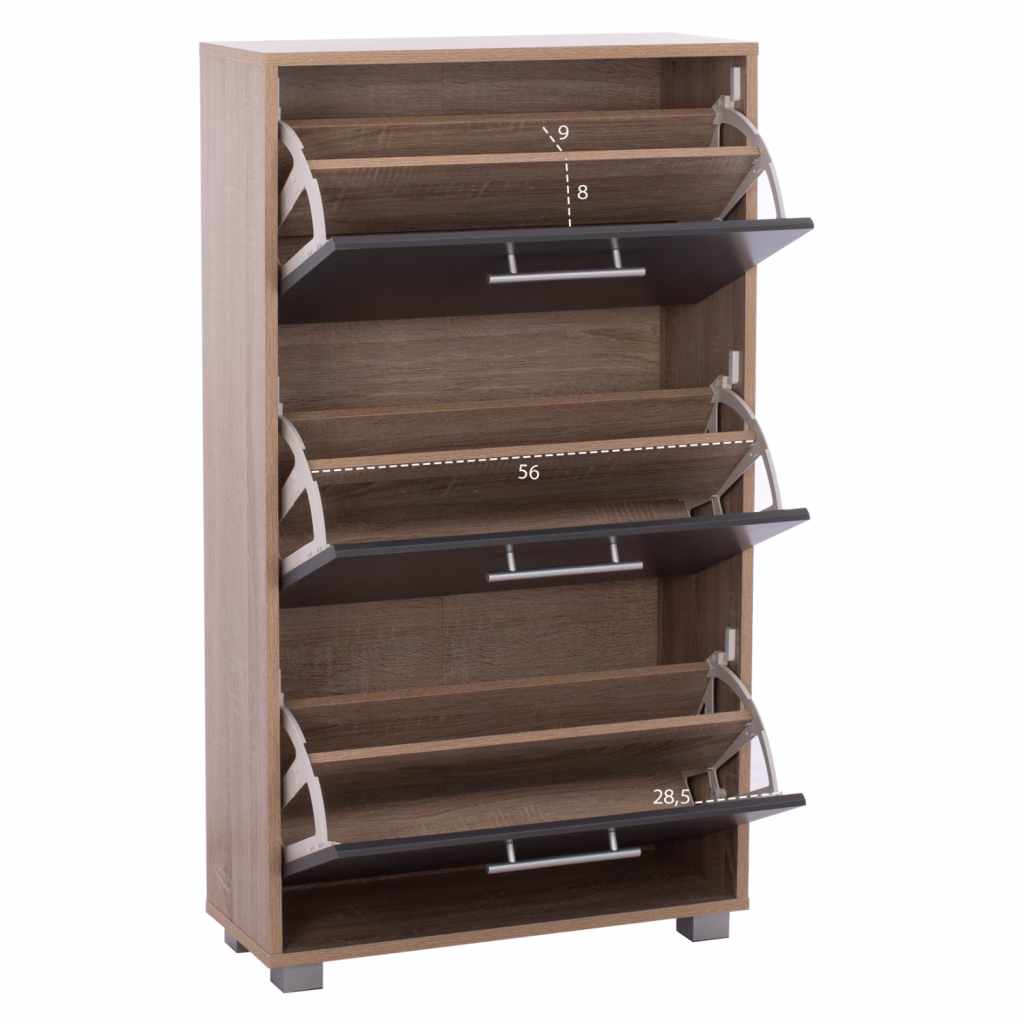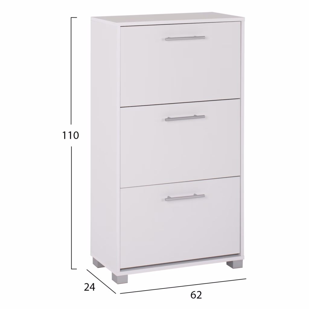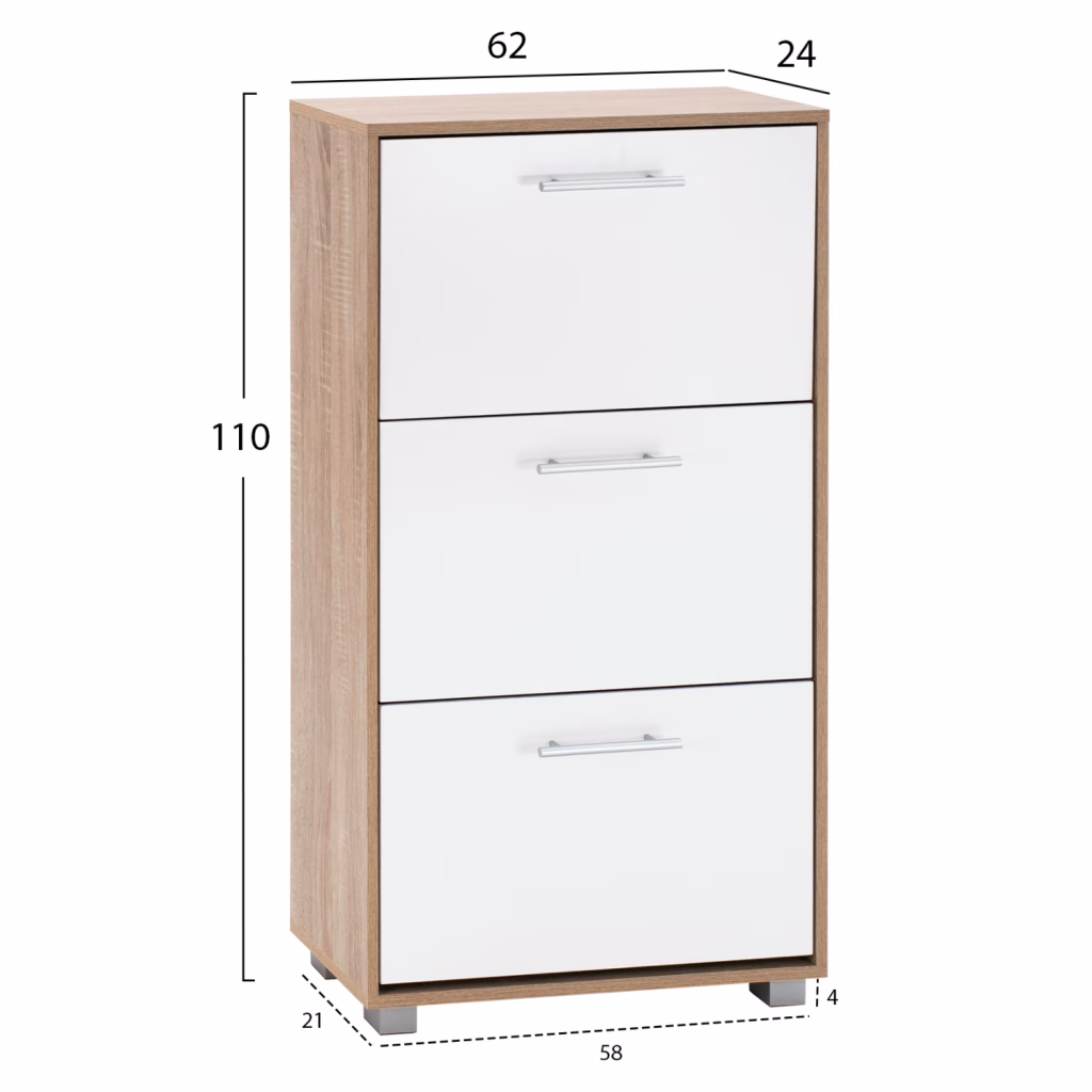 Παπουτσοθήκη από μελαμίνη άριστης ποιότητας, με 3 ανακλινόμενα ντουλάπια που χωράνε 18-21 ζευγάρια παπούτσια. Τέσσερα ποδαράκια στη βάση της παπουτσοθήκης για εύκολη πρόσβαση κάτω από αυτή και αποφυγή καταστροφής της από νερά και υγρασία. Χρώμα: Sonama Διαστάσεις: 62x24x110Υεκ. Το προϊόν διατίθεται αμοντάριστο σε πακέτο.