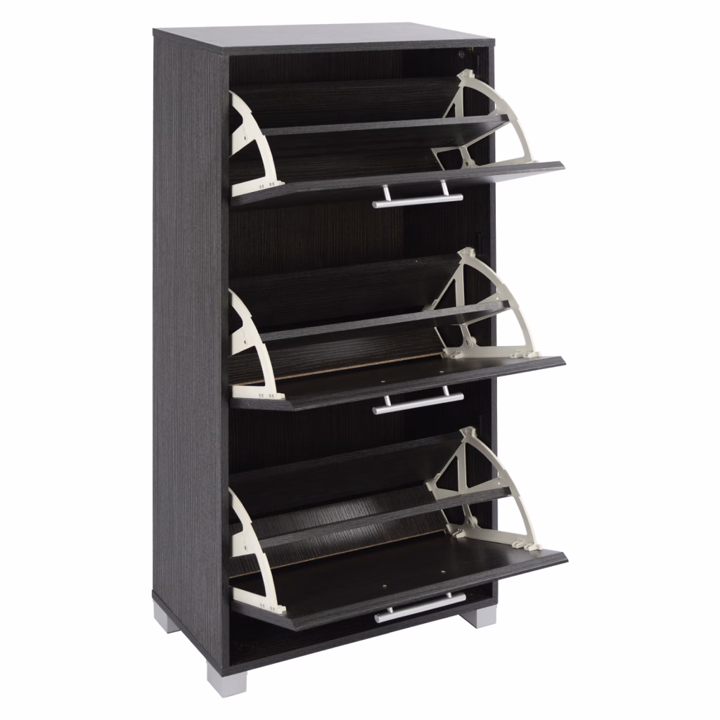Παπουτσοθήκη από μελαμίνη άριστης ποιότητας, με 3 ανακλινόμενα ντουλάπια που χωράνε 18-21 ζευγάρια παπούτσια. Τέσσερα ποδαράκια στη βάση της παπουτσοθήκης για εύκολη πρόσβαση κάτω από αυτή και αποφυγή καταστροφής της από νερά και υγρασία. Χρώμα: Zebrano Διαστάσεις: 62x24x110Y εκ. Το προϊόν διατίθεται αμοντάριστο σε πακέτο.