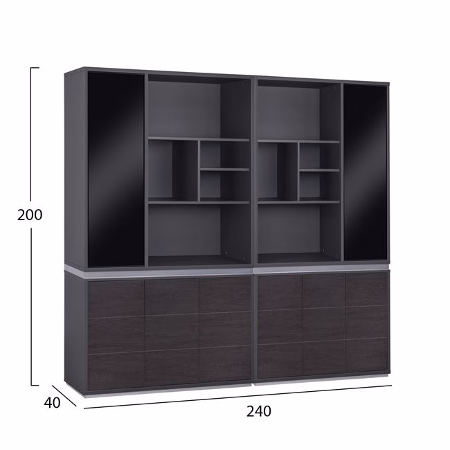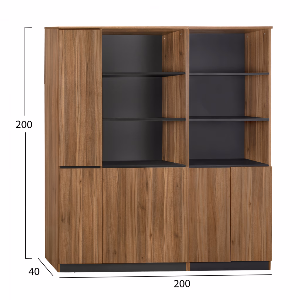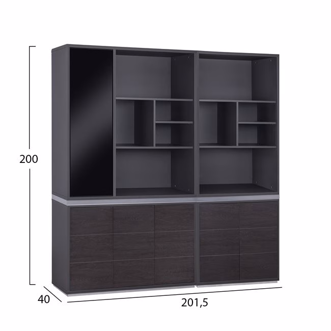 Σετ επαγγελματικής βιβλιοθήκης γραφείου από μελαμίνη σε γκρι και βέγγε απόχρωση. Διαθέτει επτά ντουλάπια με εσωτερικό ράφι, δύο στο επάνω μέρος και πέντε στο κάτω και εννέα ανοιχτούς αποθηκευτικούς χώρους. Τοποθετήστε τα βιβλία, τις εγκυκλοπαίδειες σας, ακόμα και διακοσμητικά χώρου και αλλάξτε την αισθητική του γραφείου σας! Διαστάσεις: 200x40x200 εκ.