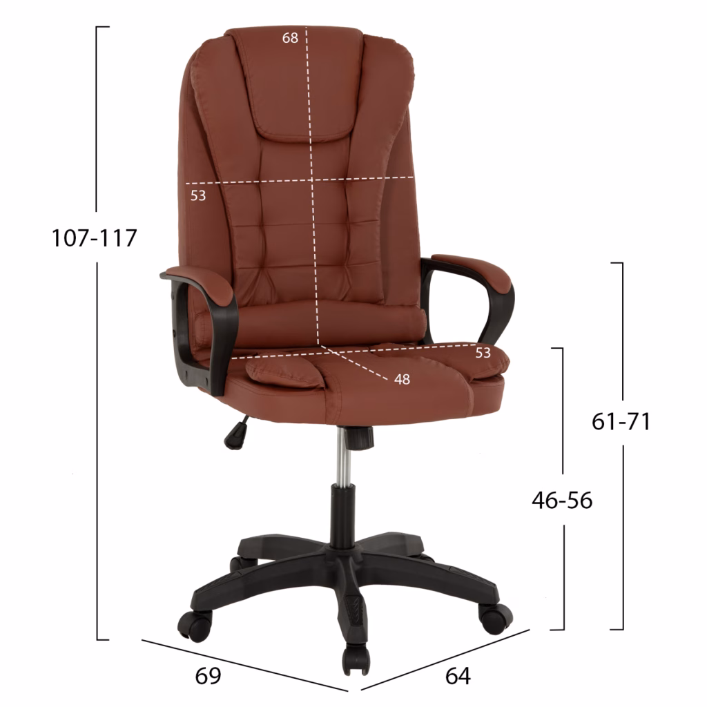 Καρέκλα γραφείου διευθυντική με μπράτσα και ανάκλιση. Από υψηλής ποιότητας PU σε καπουτσίνο χρώμα και μοναδικό design. Ιδανική για αυτούς που κάθονται αρκετές ώρες μπροστά στον υπολογιστή. Μπράτσα μεταλλικά ενισχυμένα βαρέως τύπου επιχρωμιωμένα. Αστέρι μεταλλικό βαρέως τύπου επιχρωμιωμένο. Ροδάκια ενισχυμένα. Κάθισμα και πλάτη με ανατομικά μαξιλαράκια στήριξης. Διαστάσεις: 65x73x126 εκ. Min ύψος: 116 εκ. Max […]