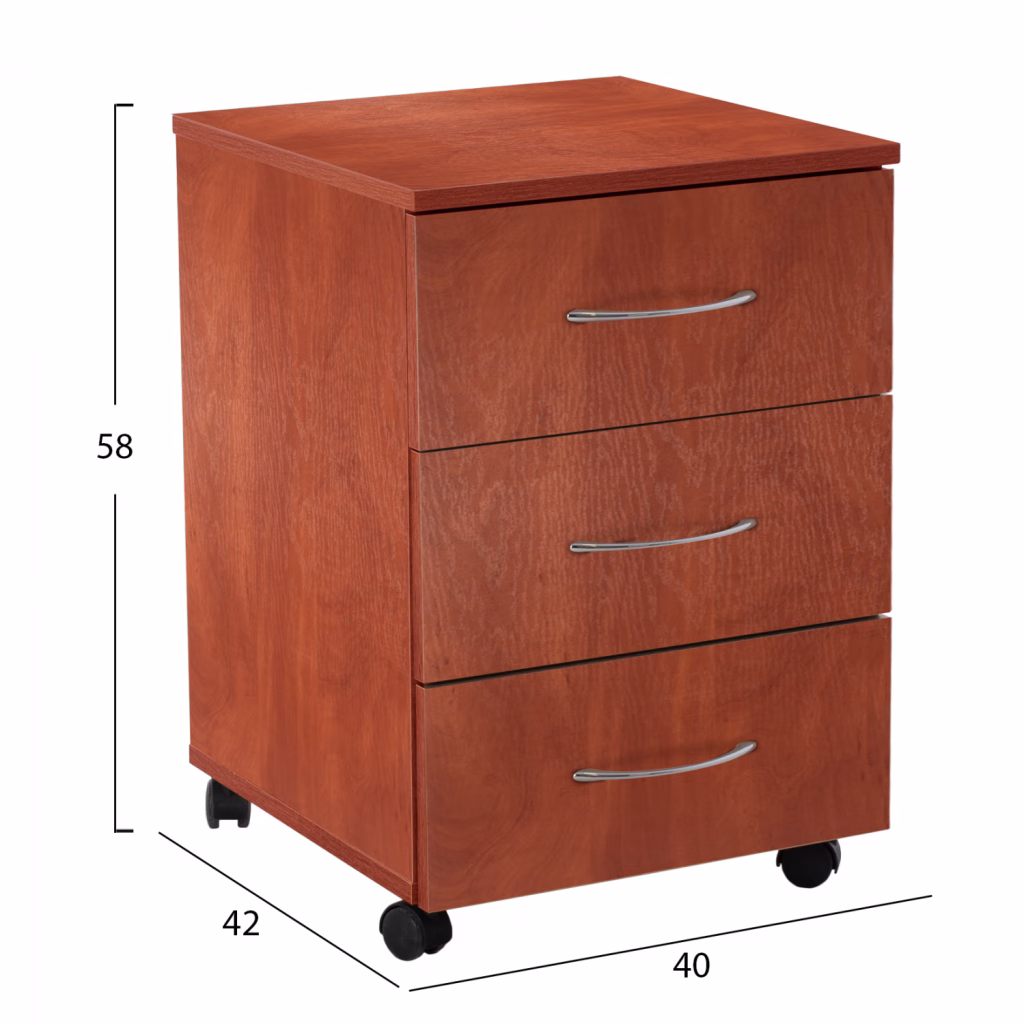 Συρταριέρα γραφείου για επαγγελματική χρήση, κατασκευασμένη από ανθεκτική μελαμίνη σε κερασί απόχρωση με κλειδαριά για τα 2 πρώτα συρτάρια, σχεδιασμένη για να αποθηκεύεις έντυπα και τα καθημερινά μικροαντικείμενα του γραφείου σου. Διαστάσεις: 40x46x75 εκ. Εσωτερικές διαστάσεις συρταριών: 30x28x7,5Y εκ. Εσωτερική διάσταση κάτω συρταριού: 30x28x9Υ εκ. Παρατηρήσεις: Το προϊόν παραδίδεται αμοντάριστο, σε εργοστασιακή συσκευασία.