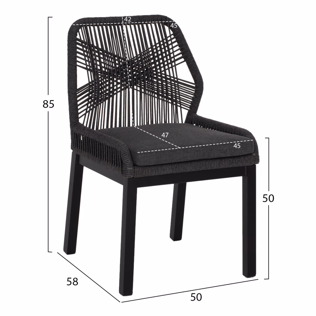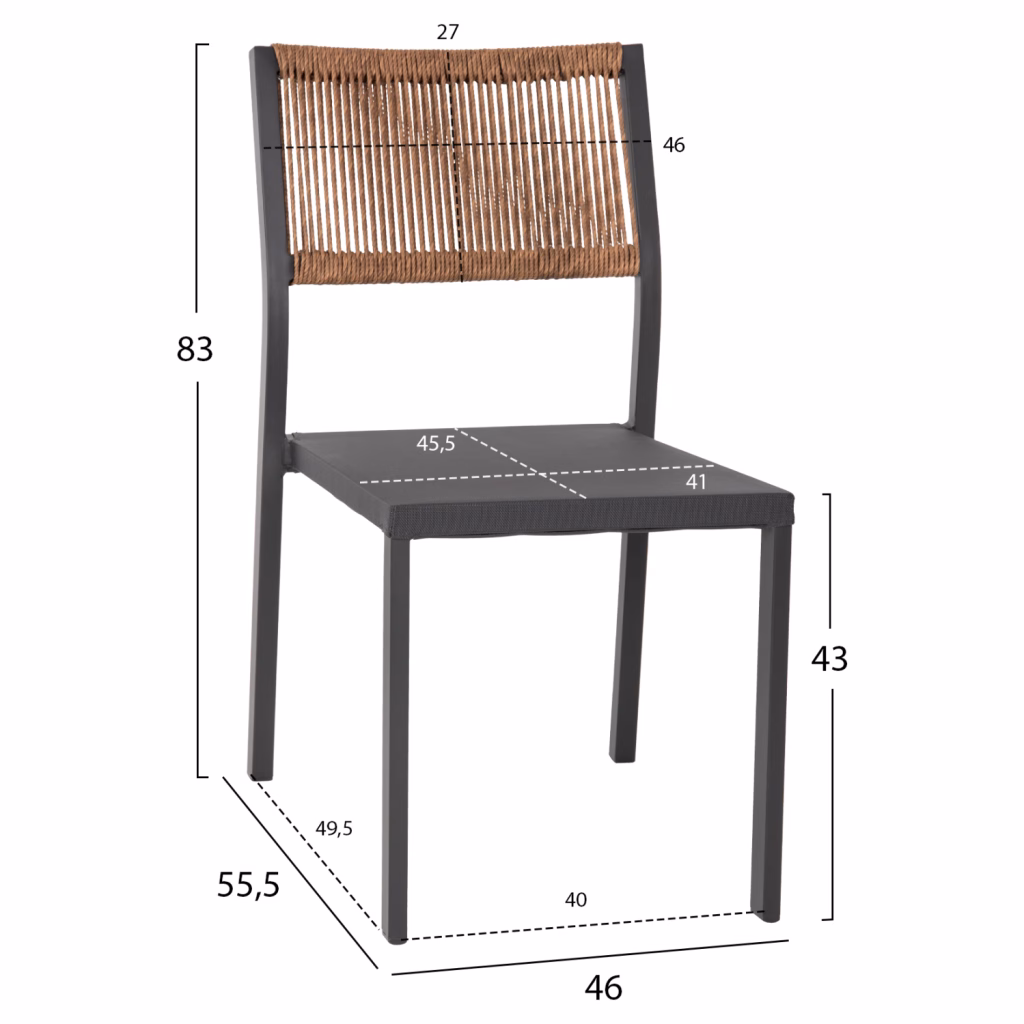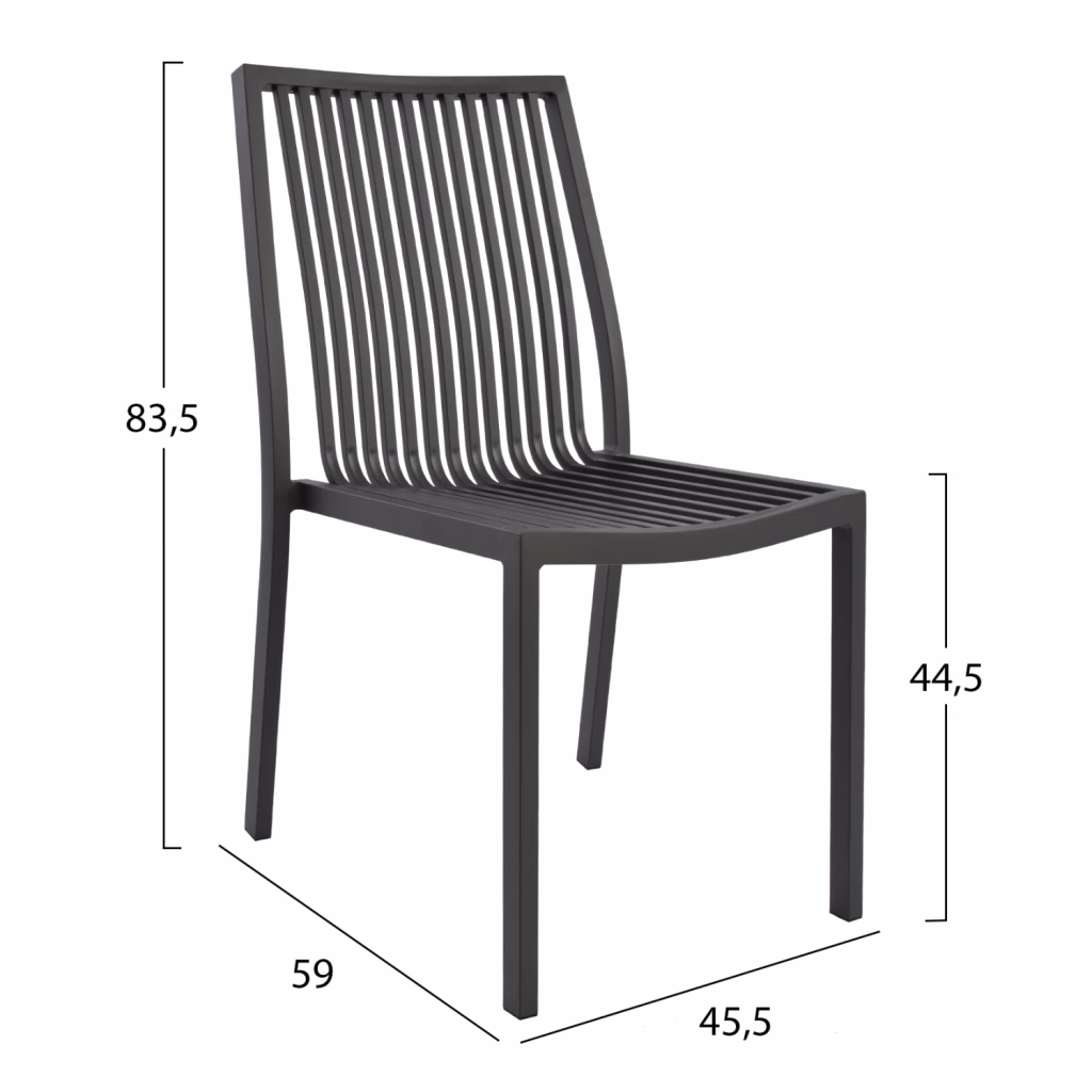Καρέκλα αλουμινίου γκρι κατάλληλη για εξωτερικό χώρο, κατασκευή επαγγελματικών προδιαγραφών, με μεγάλη αντοχή σε ήλιο και βροχή. Διαστάσεις : 45,5x59x83,5 εκ. Ύψος καθίσματος: 44,5 εκ.