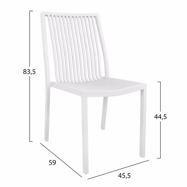 Καρέκλα αλουμινίου λευκή κατάλληλη για εξωτερικό χώρο, κατασκευή επαγγελματικών προδιαγραφών, με μεγάλη αντοχή σε ήλιο και βροχή. Διαστάσεις : 45,5x59x83,5 εκ. Ύψος καθίσματος: 44,5 εκ.