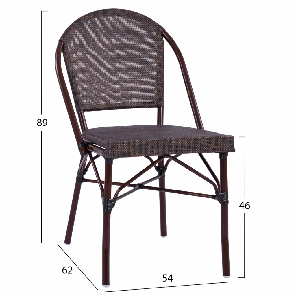 Καρέκλα αλουμινίου “Bamboo Look” με αδιάβροχο ύφασμα textilene, σε πλάτη και κάθισμα, ιδανική για εξωτερικό χώρο, μεγάλης αντοχής σε ήλιο και βροχή. Είναι κατασκευασμένη από σκελετό αλουμινίου και βαμμένη έτσι ώστε να αποδίδει την όψη του ξύλου. Διαστάσεις εξωτερικές: 40,5×56,5×89,5 εκ. Διαστάσεις καθίσματος: 40,5×42 εκ. Χρώμα σκελετού: Απομίμηση ξύλου Χρώμα υφάσματος: Καφέ