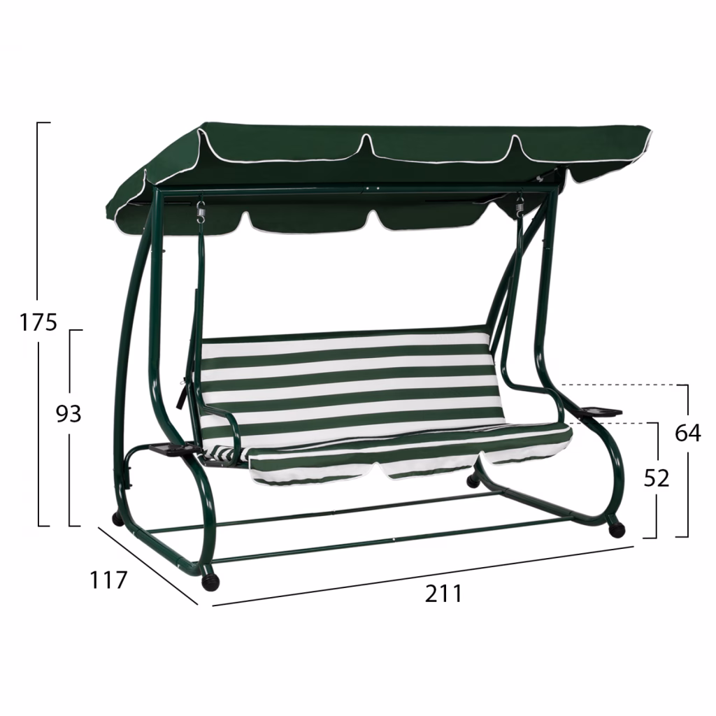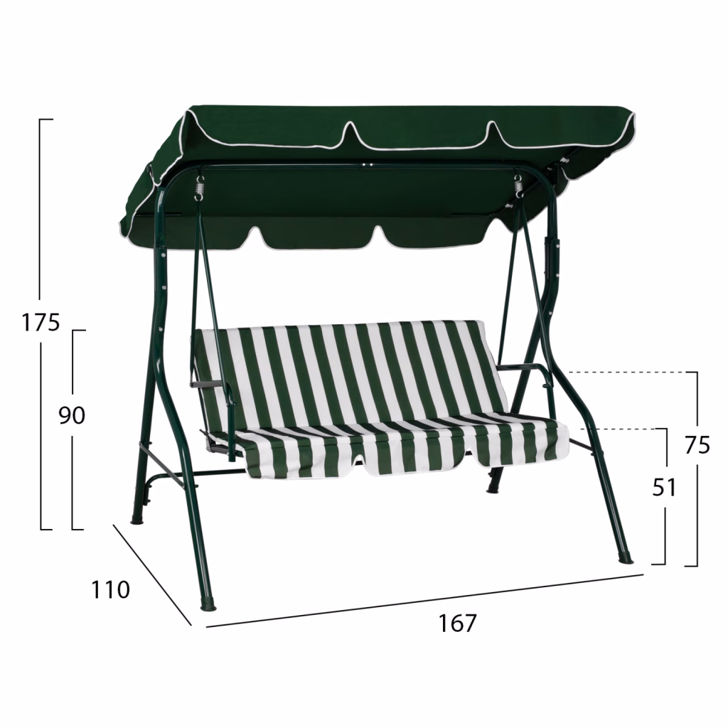 Κούνια τριθέσια με ριγέ μοτίβο σε πράσινο και λευκό χρώμα. Σκελετός: Πράσινο Ύφασμα: Πράσινο ριγέ λευκό. Υφασμάτινη τέντα ρυθμιζόμενη. Διαστάσεις κούνιας: 167x110x175 εκ. Διαστάσεις καθίσματος: 129×43 εκ. Ύψος καθίσματος: 51 εκ. Ύψος μπράτσου: 75 εκ. Ύψος πλάτης: 90 εκ.