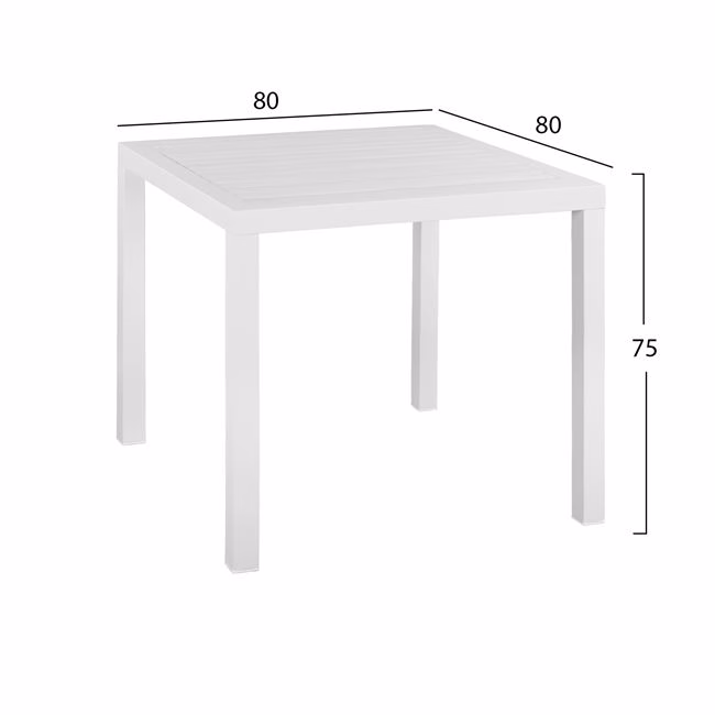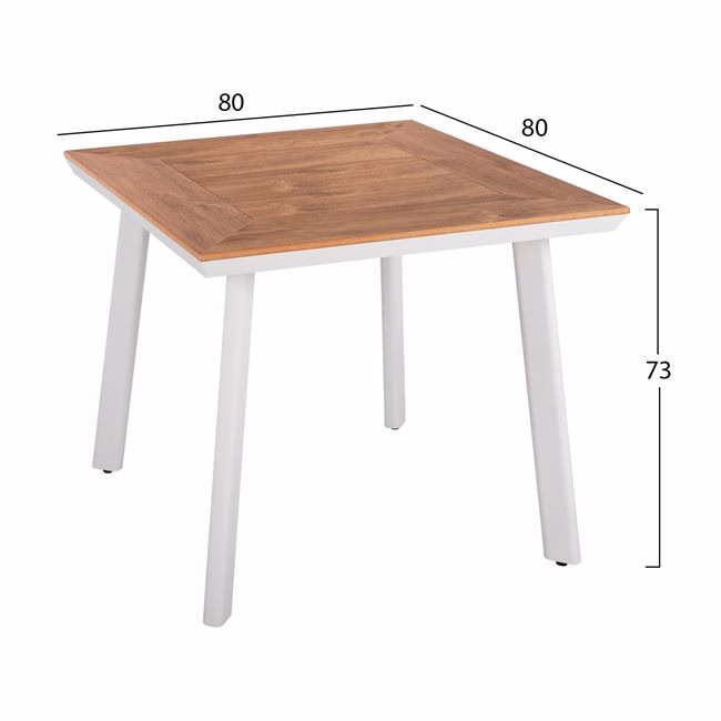 ΤΟ ΣΕΤ ΠΕΡΙΛΑΜΒΑΝΕΙ Ένα τραπέζι κατασκευασμένο από σκελετό αλουμινίου σε λευκή απόχρωση και επιφάνεια Polywood σε φυσική απόχρωση ξύλου. Διαστάσεις: 80x80x73 εκ. Δύο καρέκλες αλουμινίου σε λευκή απόχρωση, επαγγελματικών προδιαγραφών, με μεγάλη αντοχή σε ήλιο και βροχή. Διαστάσεις: 45,5x59x83,5 εκ. Ύψος καθίσματος: 44,5 εκ.