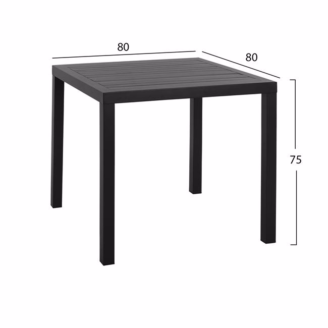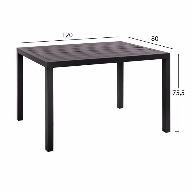 ΤΟ ΣΕΤ ΠΕΡΙΛΑΜΒΑΝΕΙ Ένα τραπέζι κατασκευασμένο από σκελετό αλουμινίου σε ανθρακί απόχρωση. Διαστάσεις: 120x80x75,5 εκ. Τέσσερις πολυθρόνες αλουμινίου, επαγγελματικών προδιαγραφών με ανθρακί σκελετό και κάθισμα από μαύρο textline. Διαστάσεις πολυθρόνας: 55,5x64x87 εκ. Ύψος καθίσματος: 44 εκ. Ύψος μπράτσων: 64 εκ. Διαστάσεις καθίσματος: 41×46 εκ.