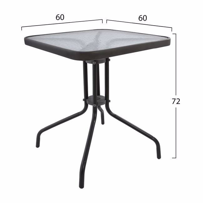 ΤΟ ΣΕΤ ΠΕΡΙΛΑΜΒΑΝΕΙ Ένα τραπέζι μεταλλικό εξωτερικού χώρου σε χρώμα γκρι-ανθρακί, με ενσωματωμένο τζαμί ασφάλειας (secure). Διαστ. Τραπεζιού: 60x60x72 εκ. Δύο πολυθρόνες εξωτερικού χώρου από μεταλλικό σκελετό σε γκρι χρώμα με textilene 2×1 μεγάλης αντοχής σε ήλιο και βροχή. Διαστ. Καρέκλας: 54x70x93 εκ. Ύψος καθίσματος: 43 εκ. Ύψος μπράτσων: 59 εκ.