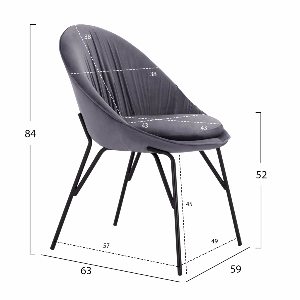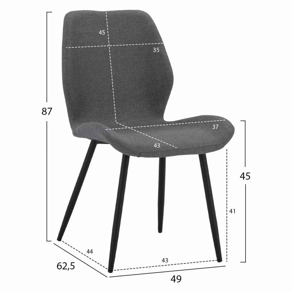 Η καρέκλα Klay είναι κατασκευασμένη από μεταλλικό μαύρο σκελετό και επενδυμένη με ύφασμα σε γκρι απόχρωση. Διαστάσεις: 49×62,5×87Υ εκ. Ύψος καθίσματος: 45 εκ. Διαστάσεις καθίσματος: 37×43 εκ. Διάσταση πλάτης: 35×45Υ εκ. Ύψος ποδιών: 41 εκ. Απόσταση ποδιών: 43×44 εκ.