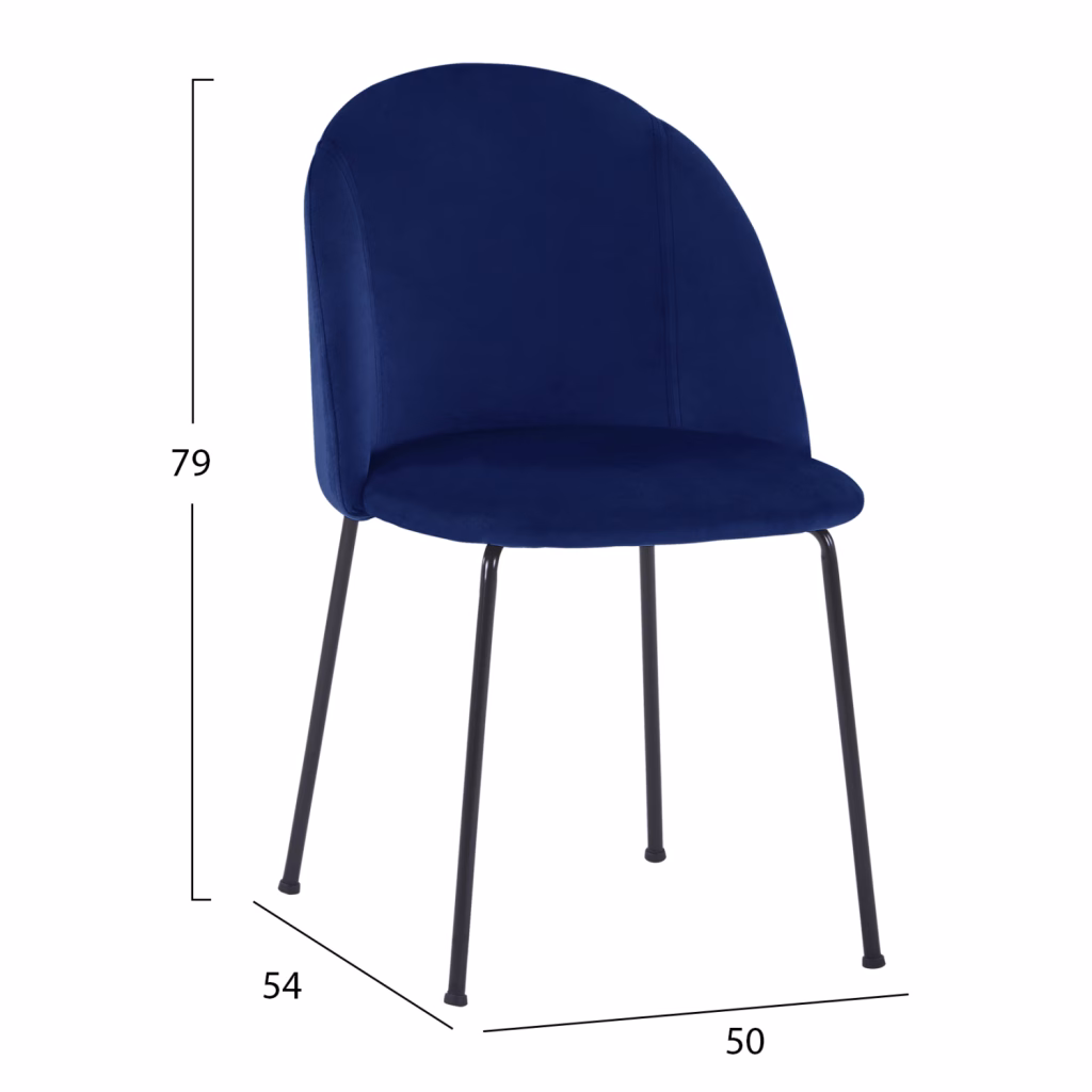 Καρέκλα CLARA επενδυμένη με βελούδο σε μπλε απόχρωση και μεταλλικά πόδια σε μαύρο ματ απόχρωση. Ένα άγγιγμα κομψότητας, σε συνδυασμό με αμέτρητες χρωματικές παραλλαγές και σχήματα. Το ελαφρώς λαμπερό ύφασμα με την αδιαμφισβήτητη εμφάνιση και αίσθηση δεν είναι χωρίς λόγο μια από τις ζωντανές τάσεις κατ ‘εξοχήν. Η βελούδινη κάλυψη κάνει τη διαφορά! Διαστάσεις:50x54x79Υ εκ.