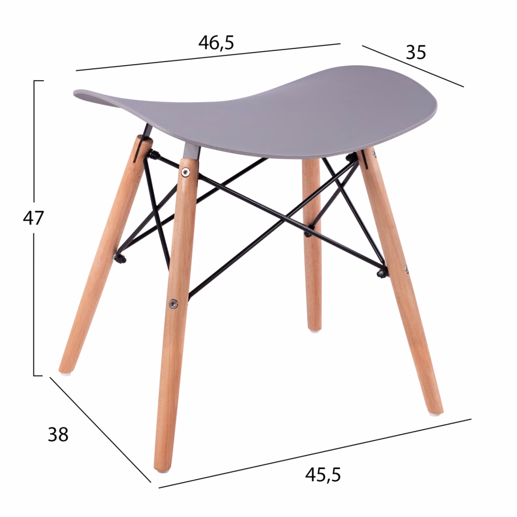 Σκαμπώ από πολυπροπυλένιο σε mat υφή και γκρι χρώμα. Τα πόδια του σκαμπώ είναι απο μασίφ ξύλο. Διαστάσεις καθίσματος: 46,5x35x47 εκ. Ύψος καθίσματος: 42 εκ. Διαστάσεις ποδιών: 45,5×38 εκ.