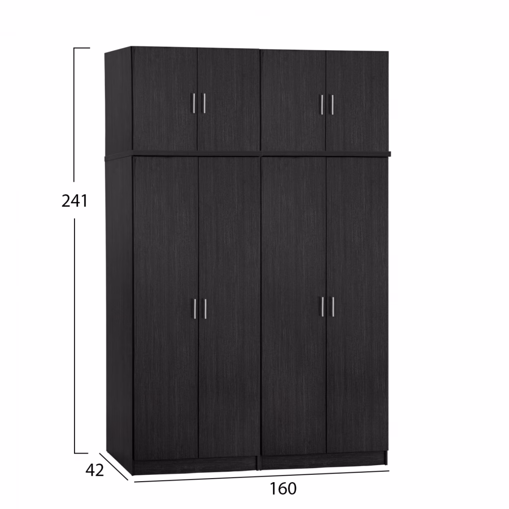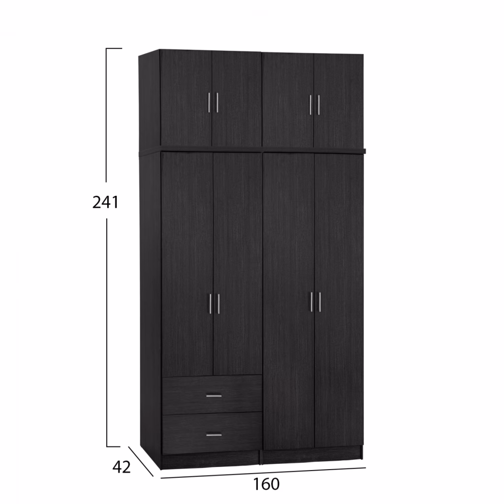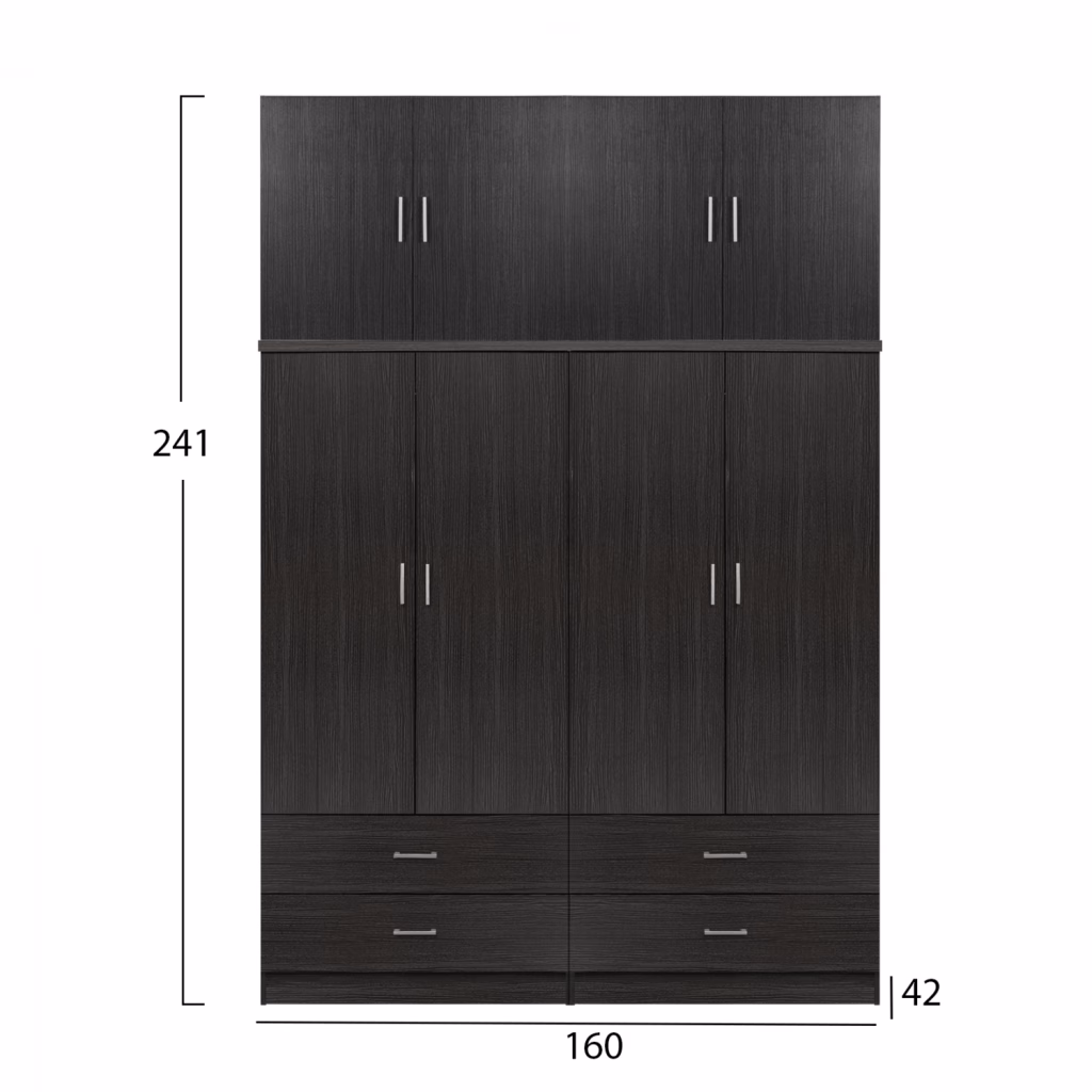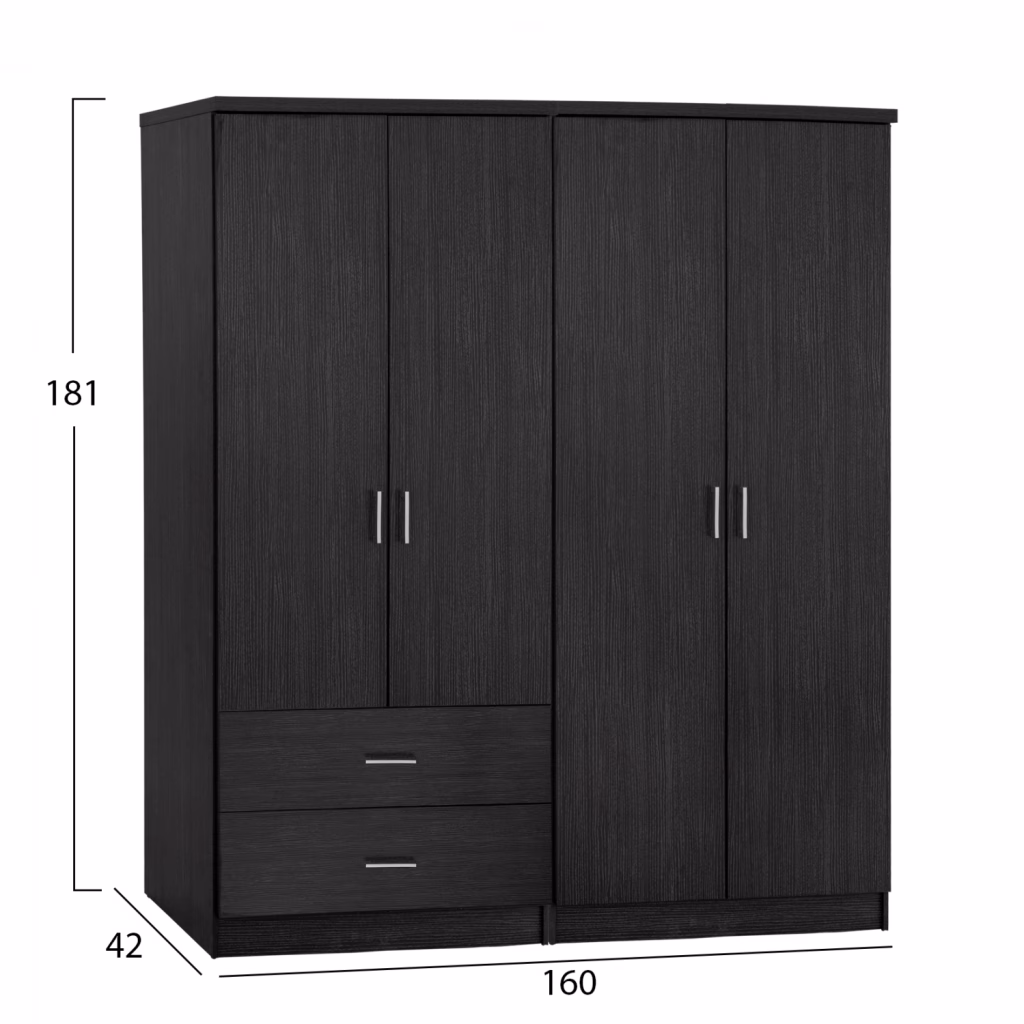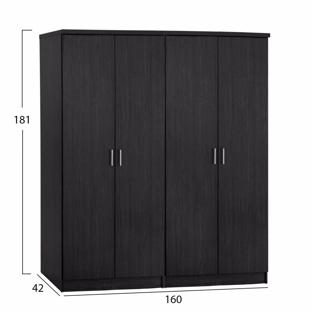 Ντουλάπα μελαμίνης τετράφυλλη σε χρώμα Zebrano. Στο εσωτερικό της ντουλάπας υπάρχει μεταλλικό δοκάρι ειδικά κατασκευασμένο για κρέμαση ρούχων. Διαστάσεις: 160x42x181 εκ. Παρατηρήσεις Η ντουλάπα διατίθεται σε πακέτο αμοντάριστη με αναλυτικές οδηγίες συναρμολόγησης. Το σετ αποτελείτε από 2 ντουλάπες οι οποίες μπορούν να τοποθετηθούν και ανεξάρτητα.