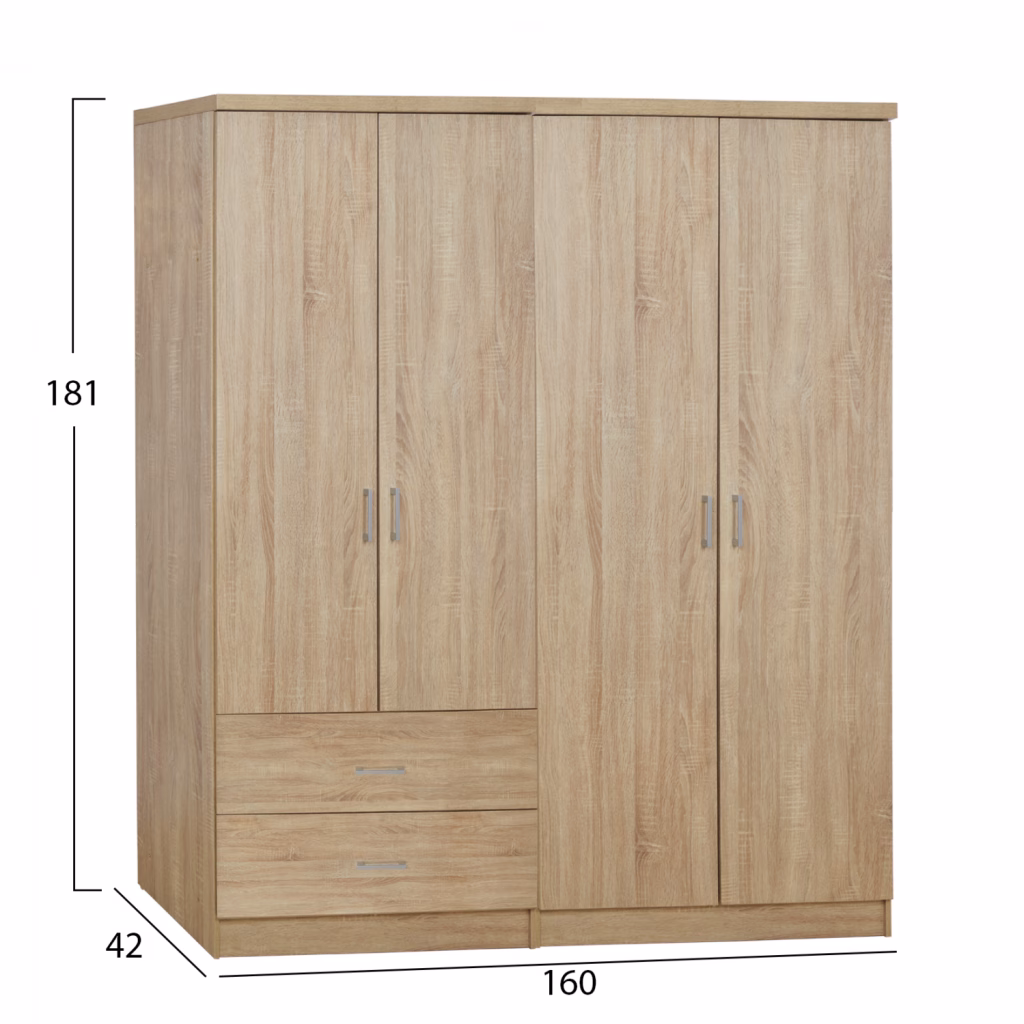Ντουλάπα μελαμίνης τετράφυλλη σε χρώμα sonama. Στο εσωτερικό της ντουλάπας υπάρχει μεταλλικό δοκάρι ειδικά κατασκευασμένο για κρέμαση ρούχων. Διαστάσεις: 160x42x181 εκ. Παρατηρήσεις Η ντουλάπα διατίθεται σε πακέτο αμοντάριστη με αναλυτικές οδηγίες συναρμολόγησης. Το σετ αποτελείτε από 2 ντουλάπες οι οποίες μπορούν να τοποθετηθούν και ανεξάρτητα.