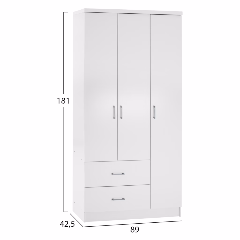 Ντουλάπα μελαμίνης τρίφυλλη σε λευκή απόχρωση. Στο εσωτερικό της ντουλάπας υπάρχει μεταλλικό δοκάρι ειδικά κατασκευασμένο για κρέμαση ρούχων και στο κάτω μέρος υπάρχουν 2 μεγάλα συρτάρια για αποθήκευση ρούχων. Στο μονό φύλλο υπάρχουν 4 χώροι αποθήκευσης. Διαστάσεις: 89×42,5×181 εκ. Διαστάσεις ραφιών Α: 28x40x41 εκ. Διαστάσεις ραφιών Β: 28x40x41,5 εκ. Διαστάσεις ραφιών Γ: 28x40x39,5 εκ. Διαστάσεις […]