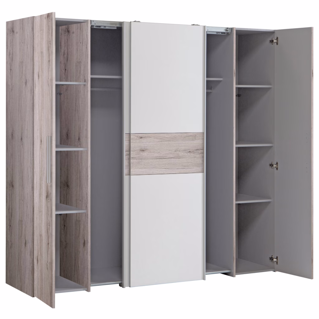 Συρόμενη ντουλάπα 4φυλλη, σε σταχτί απόχρωση με λευκές λεπτομέρειες. Κατασκευασμένη από μελαμίνη υψηλής ποιότητας. Διαθέτει δύο συρόμενες πόρτες με φρένα ασφαλείας για μεγαλύτερη εξοικονόμηση χώρου και 2 ανοιγόμενες. Στην αριστερή και δεξιά πλευρά του εσωτερικού της ντουλάπας, υπάρχουν τέσσερα ράφια ( πέντε χώροι αποθήκευσης ) για κάθε πλευρά. Στην μεσαία πλευρά του εσωτερικού της ντουλάπας, […]