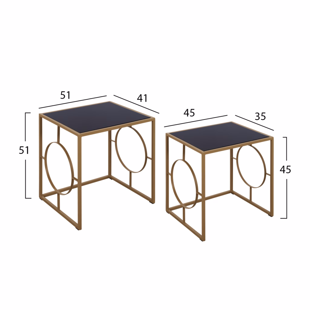 Βοηθητικά τραπεζάκια σαλονιού σετ 2τμχ. MARSHAL κατασκευασμένα από μεταλλικό σκελετό σε χρυσή απόχρωση και γυάλινη μαύρη επιφάνεια. Διαστάσεις μεγάλου τραπεζιού: 51x41x51 εκ. Διαστάσεις μικρού τραπεζιού: 45x35x45 εκ.