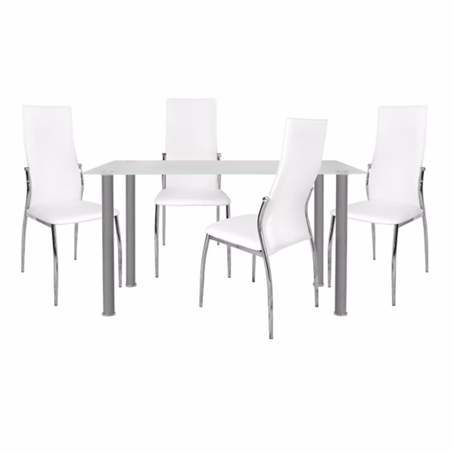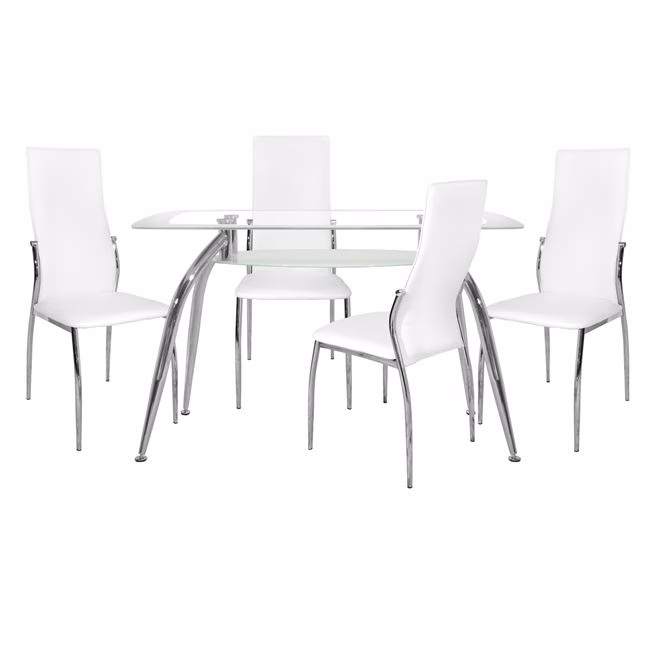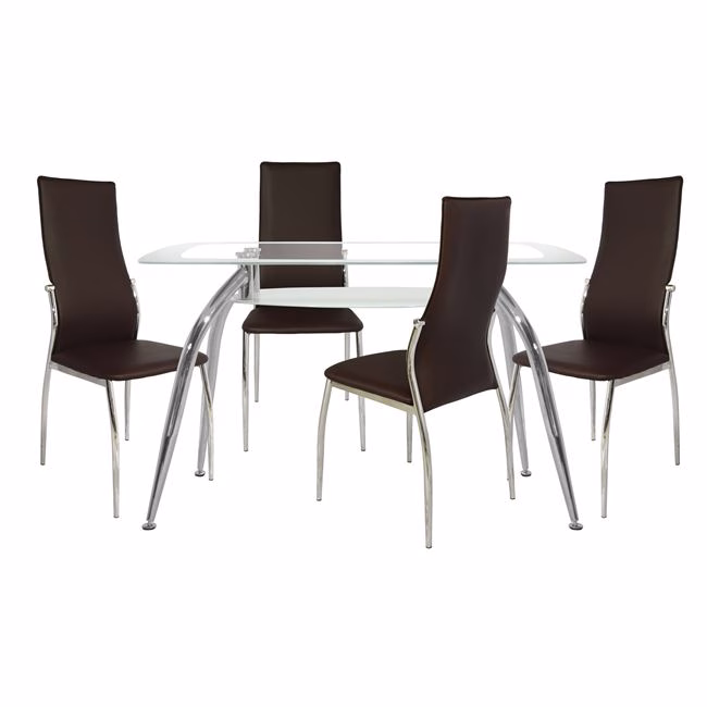 ΤΟ ΣΕΤ ΠΕΡΙΛΑΜΒΑΝΕΙ Ένα τραπέζι με γυαλί ασφαλείας 8mm και μεταλλικά πόδια. Χρώμα γυαλιού: Λευκό-Διάφανο. Χρώμα μετάλλου: Χρώμιο. Διαστάσεις: 120x75x75 εκ. Τέσσερις καρέκλες κουζίνας από μεταλλικό σκελετό χρωμίου και επένδυση από δερματίνη σε καφέ χρώμα. Διαστάσεις εξωτερικές: 45x55x99 εκ. Διάσταση καθίσματος καθαρό: 42×38 εκ. Διάσταση πλάτης καθαρό: 38×59 εκ. Ύψος καθίσματος: 44,5 εκ. ΠΡΟΣΟΧΗ: Το […]