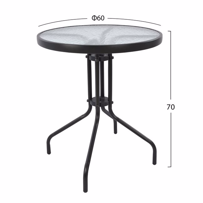 Ένα τραπέζι κατασκευασμένο από μεταλλικό σκελετό σε γκρι απόχρωση με γυάλινη επιφάνεια.