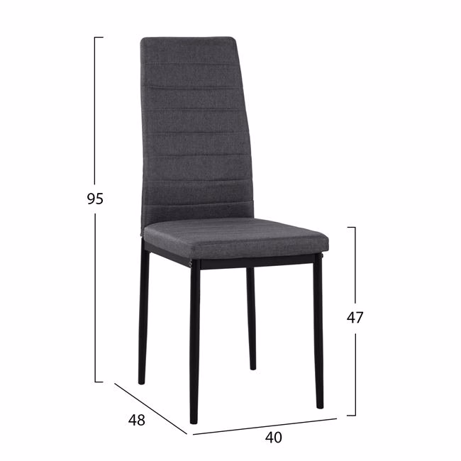 Τέσσερις καρέκλες κουζίνας από μεταλλικό σκελετό σε μαύρο χρώμα και επένδυση από ύφασμα σε γκρι απόχρωση.