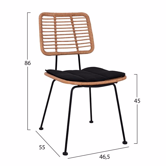 Τέσσερις καρέκλες κατασκευασμένες από μεταλλικό σκελετό σε μαύρη απόχρωση και επενδυμένες με πλεκτό wicker σε μπεζ απόχρωση.