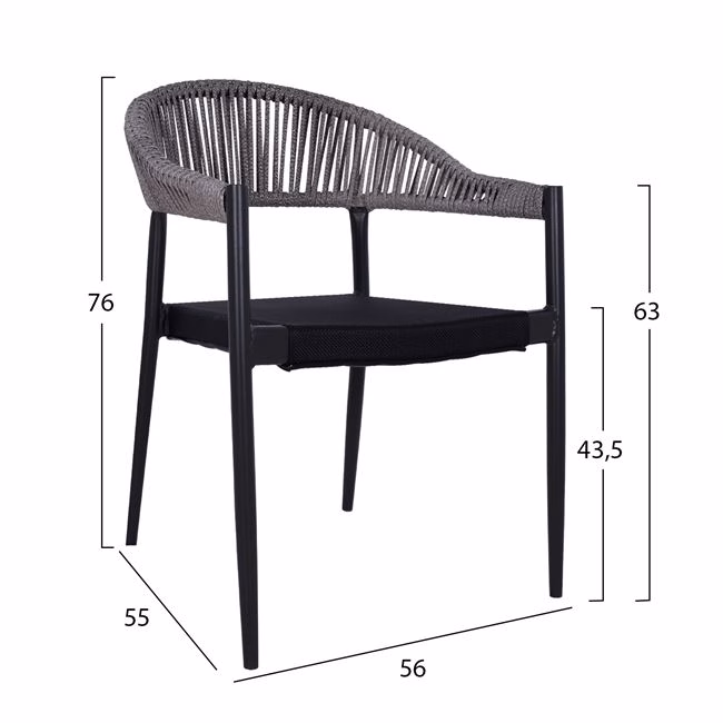Τέσσερις πολυθρόνες αλουμινίου, επαγγελματικών προδιαγραφών με γκρι σκελετό, επενδυμένες με πλεκτό wicker και κάθισμα από μαύρο textiline.